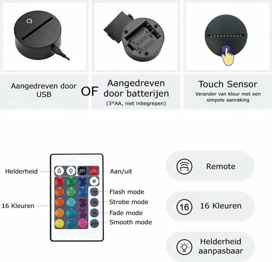 ANiMU 3D Lamp – 16 Kleuren – Dinosaurus – LED Illusie – Bureaulamp – Nachtlampje – Sfeerlamp – Dimbaar – USB Of Batterijen – Afstandsbediening – Cadeau Voor Jongens – Kinderen