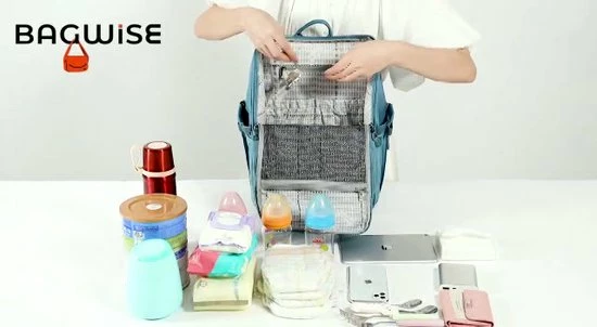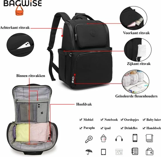 In de Bagwise Luiertas zitten meerdere vakken voor alle mogelijke spullen zoals luiers, flesjes, spuugdoekjes, extra kleding, en ook je eigen sleutels en portemonnee en smartphone en soms zelfs een laptop kunnen er in mee.