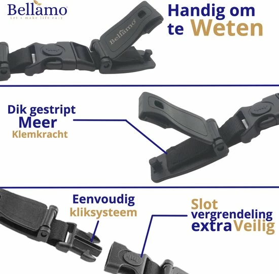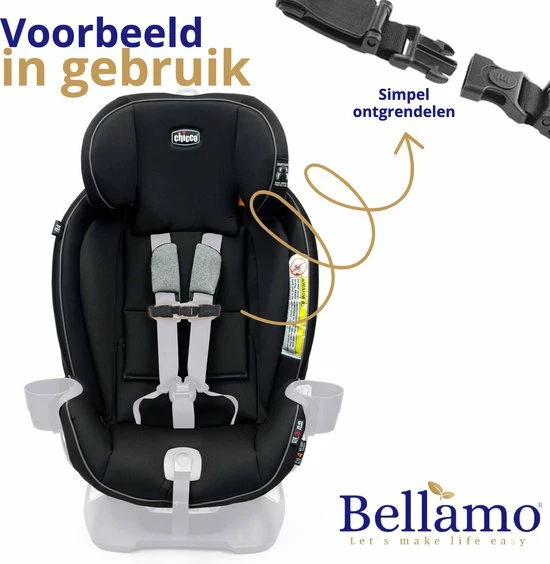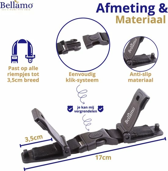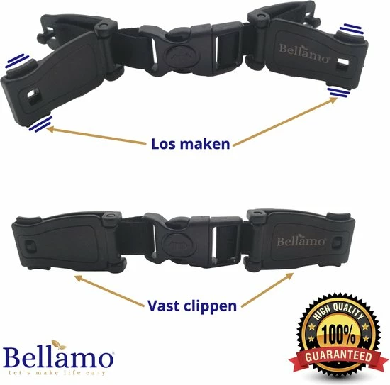 Eenvoudig kliksysteem met vergrendeling: Onze Bellamo? gordelclip heeft een kliksysteem met een extra vergrendeling. Wij weten inmiddels dat peuters op een gegeven moment er achter komen hoe ze een kliksysteem kunnen losmaken. Dankzij onze extra vergrendeling (zie foto?s) die je kan vastzetten wordt het loskrijgen van de clip bijna onmogelijk voor jouw kind.