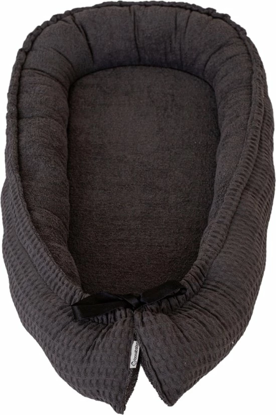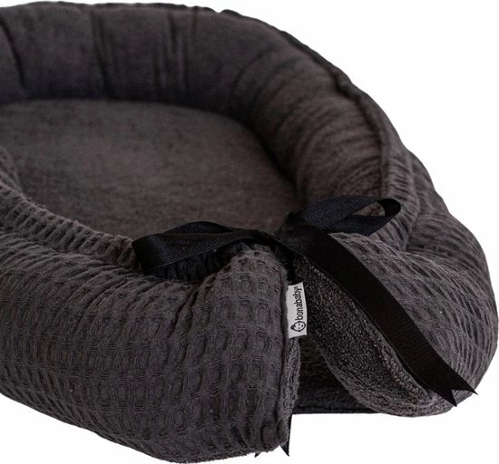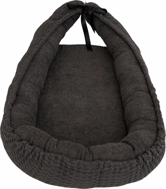 Het uiterlijk van het nestje doet een beetje aan een hondenmand denken. Rondom het mandje zit een opstaande rand, gemaakt van kussenachtig materiaal. Het is een warm, knus plekje voor je kindje om in te liggen.