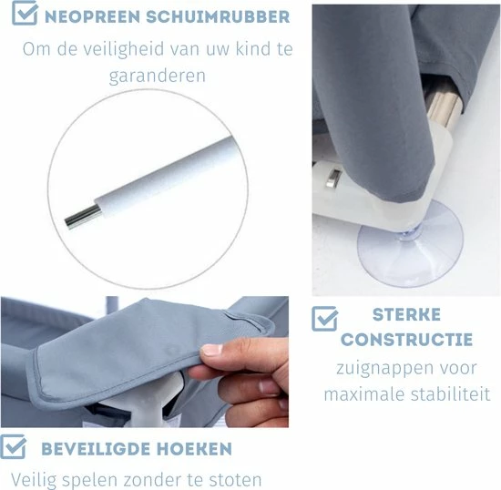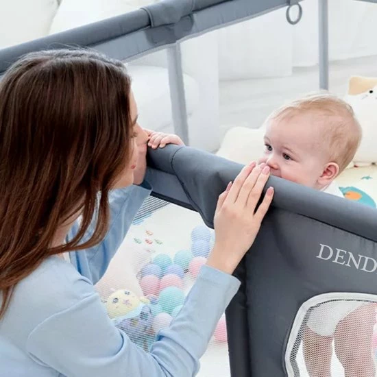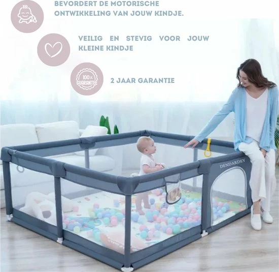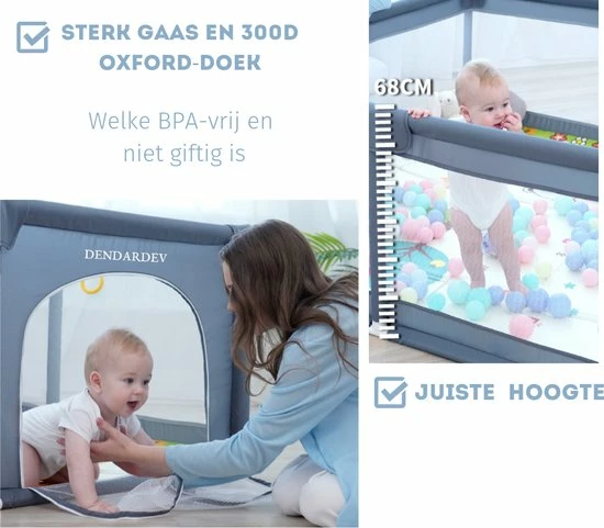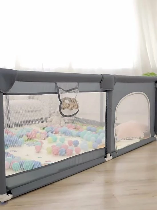 Ons kinderspeelhoek is voorzien van neopreen schuimrubber en 4 beveiligde hoeken. Hij is vervaardigd uit zeer sterk gaas en 300D Oxford-doek. De afmetingen zijn: 150?? ? 180?? ? 68??.