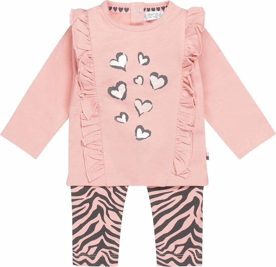 2 delige Dirkje meisjes set. De set bestaat uit een longsleeve en broekje. De roze longsleeve heeft een print met hartjes en ruches op het voorpand. De broek heeft een zebra print in de kleuren roze en donkergrijs en is afgewerkt met een sierkoordje.