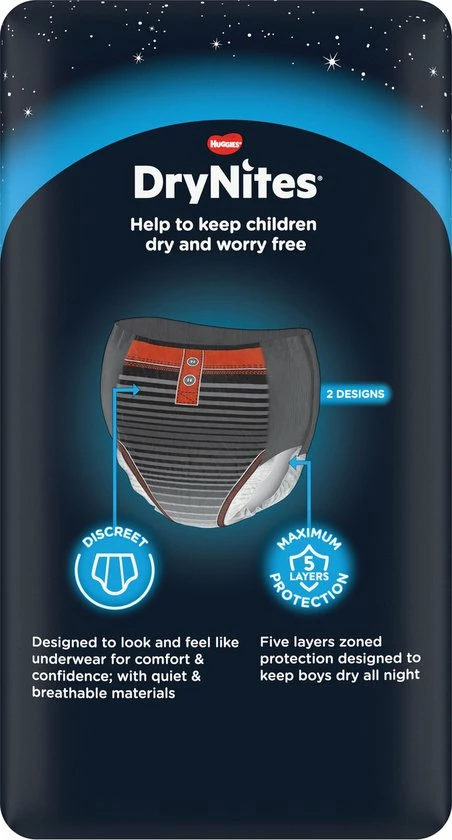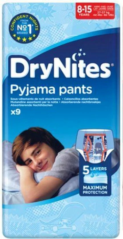 DryNites Absorberende Luierbroekjes Boy zijn er voor jouw zoon. Als jouw zoon last heeft van bedplassen kan dat vaak een moeilijke tijd zijn. Als je kind blijft bedplassen terwijl dat eigenlijk niet meer hoort, kan dat gevoelens van bezorgdheid, verwarring en/of frustratie oproepen. Met de absorberende luierbroekjes van DryNites, voor jongens van 8 tot 15 jaar, kun je hier een einde aan maken. Deze DryNites luierbroekjes geven je kind meer vertrouwen en helpen mee om het probleem op te lossen.