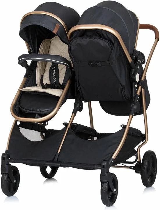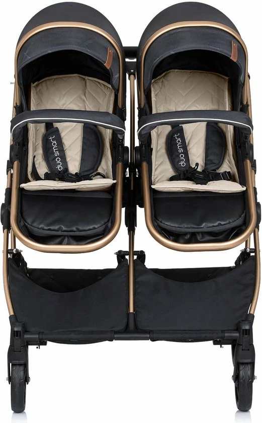 Duo Kinderwagen Chipolino Duo Smart zwart, deze tweeling kinderwagen is de start voor een magisch begin! Met 360 graden draaibare voorwielen, 5punts veiligheidsgordel en een compacte frame van lichtgewicht materiaal kan je eenvoudig en veilig op pad met je tweelingen.