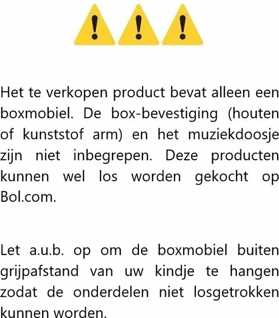 Let op aub: deze boxmobiel wordt geleverd exclusief houder en muziekdoosje, deze producten zijn wel los te koop op Bol.com.