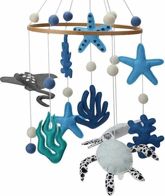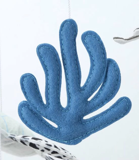 Met zachte kleuren en de mooiste blauwe zeedieren neemt deze babymobiel jou en je kindje mee op reis onder water. Deze stijlvolle babymobiel heeft een prachtige uitstraling, bestaat uit zacht duurzaam materiaal en staat perfect in elke babykamer.