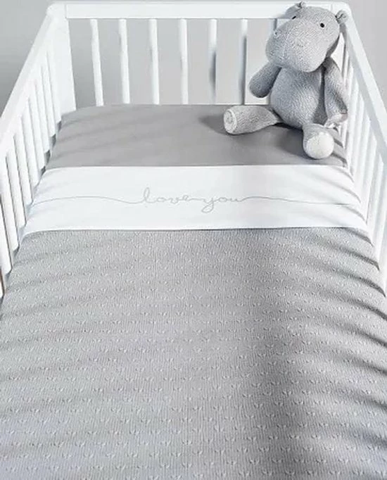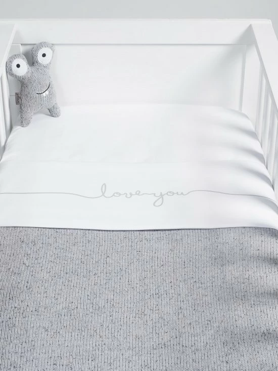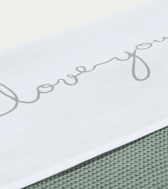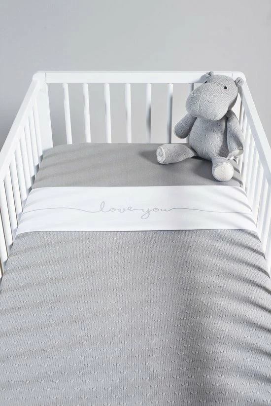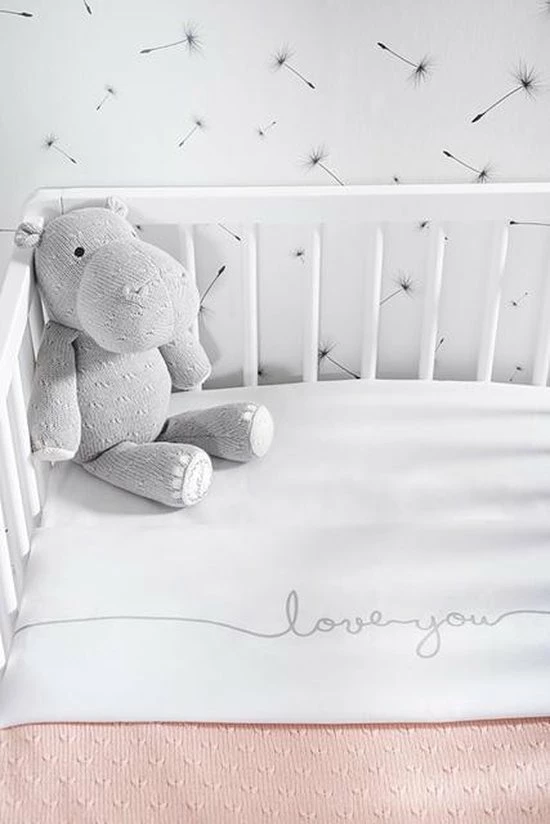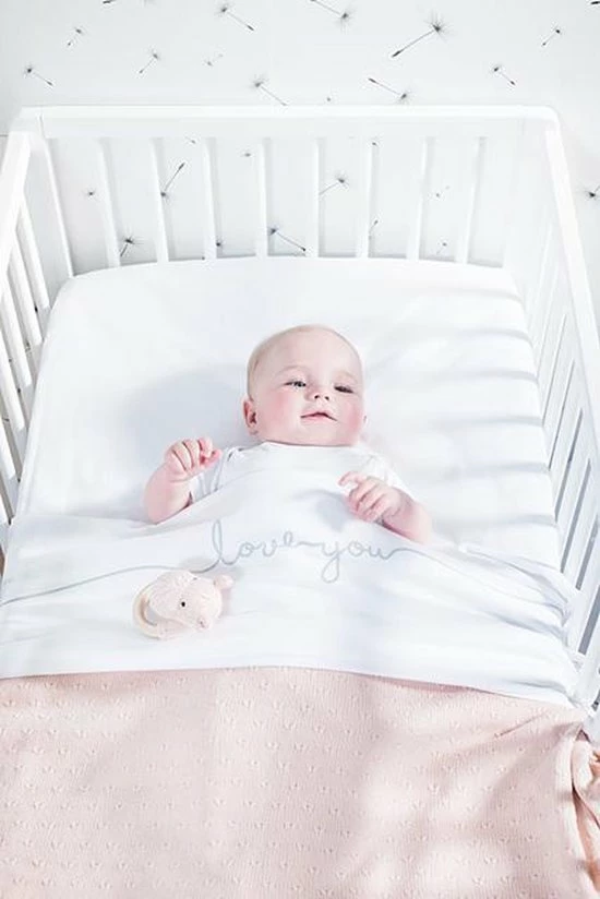 Met een wit lakentje kun je het bedje van jouw baby veilig, kort en strak opmaken. Door de zijkanten van het lakentje onder het matrasje te stoppen, slaapt jouw kleintje niet alleen veilig, maar heeft het ook een geborgen gevoel. Dit lieve lakentje met de tekst ‘love you’ past perfect bij de dekens uit het Basic knit thema en het Bliss knit thema van Jollein.