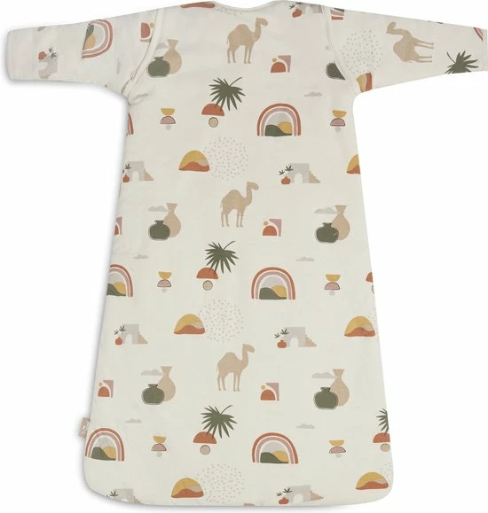 Deze prachtige Middle East print is ge?nspireerd op het Midden Oosten. Met het schattige kameeltje, palmboompjes en regenboogje waan je je in de vakantie sferen. Je combineert dit slaapzakje met leuke print met onze Pure Knit dekens.