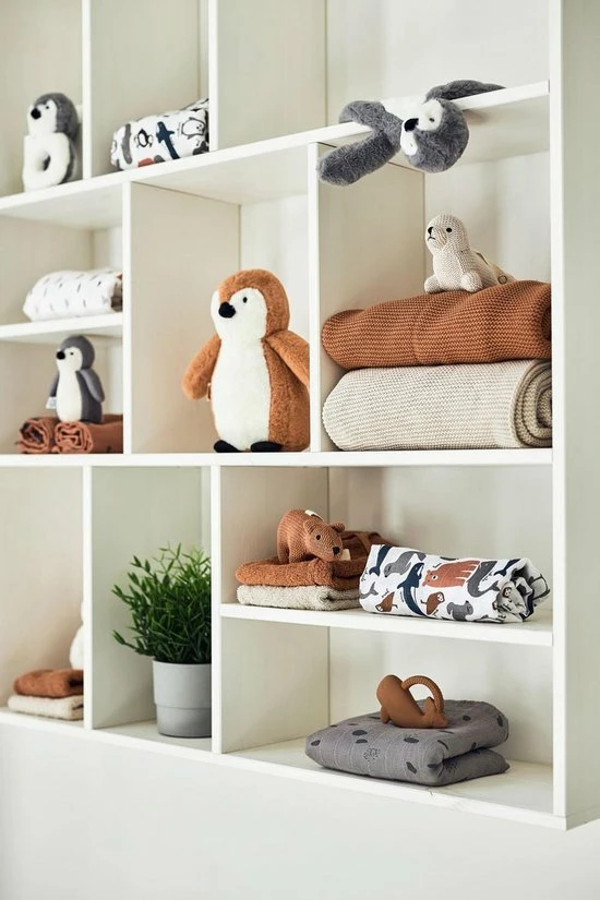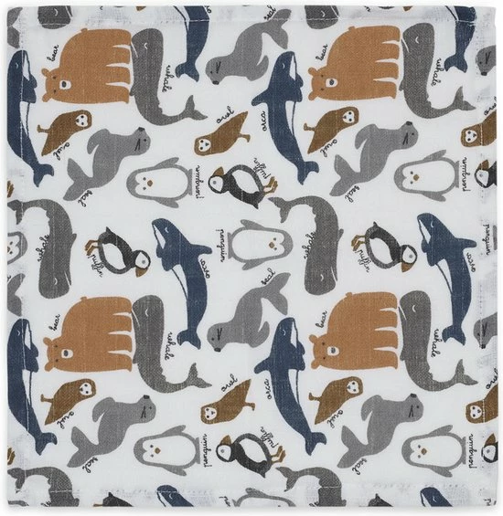 De kleuren van dit herkenbare Polar printje van Jollein zijn blauw, grijs en caremelbruin op een witte ondergrond.