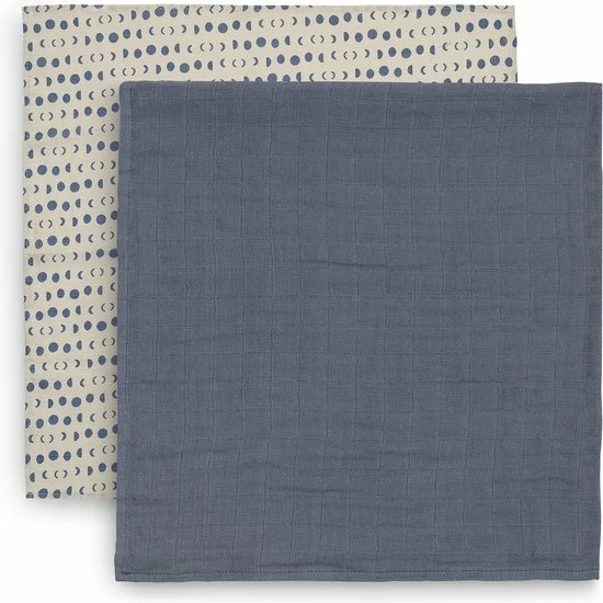 De print op de hydrofiele multidoeken is diep blauw met een grijze ondergrond en verkrijgbaar in small en large.