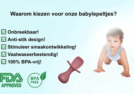 Onze producten zijn gemaakt van de beste kwaliteit FDA goedgekeurde siliconen en zijn 100% vrij van BPA, PVC, lood en andere giftige stoffen die schadelijk zijn voor uw kind. De babylepeltjes zijn tevens resistent tegen geur, vlekken en bacteri?n. De babylepels zijn bestand tegen temperaturen van -40?C tot 240?C en dragen geen warmte over.