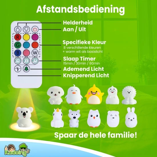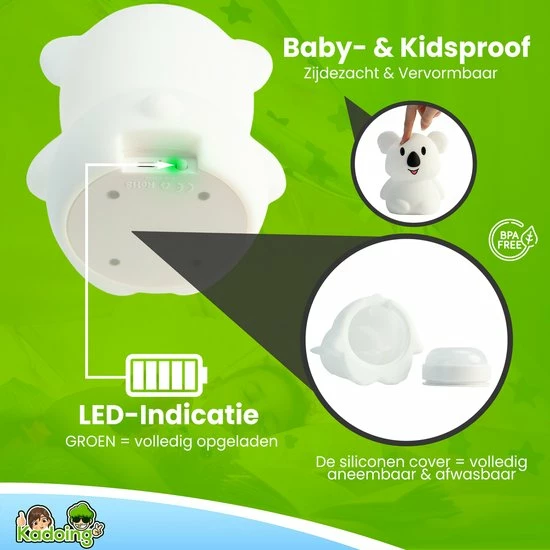 Een goede nachtrust is belangrijk voor een gezonde ontwikkeling bij kinderen. Toch kan alleen slapen in het donker voor onrustige nachten zorgen ? zowel voor kind als voor ouder. Daar hebben we bij Kadoing wat op gevonden: maak kennis met de Koala nachtlamp. Het Koala nachtlampje jaagt monsters en spoken weg, is van kindvriendelijk materiaal ?n is het ideale slaapmaatje voor in bed. Zodat kinderen de rust krijgen die essentieel is voor een gezonde ontwikkeling en zodat ouders ?s avonds met een gerust hart in bed kunnen stappen.