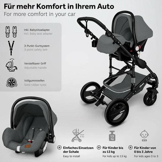 Het vervult drie basisfuncties: reiswieg, buggy en autostoeltje.