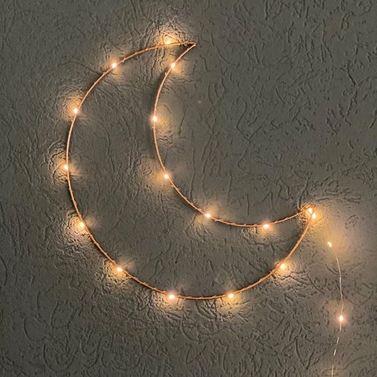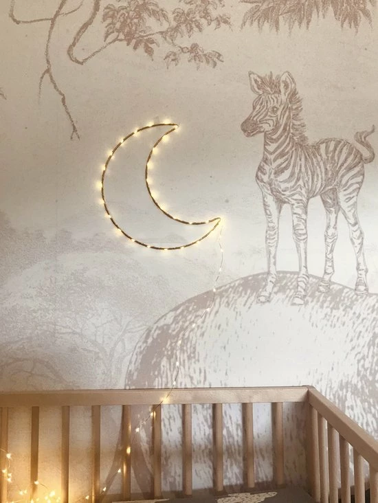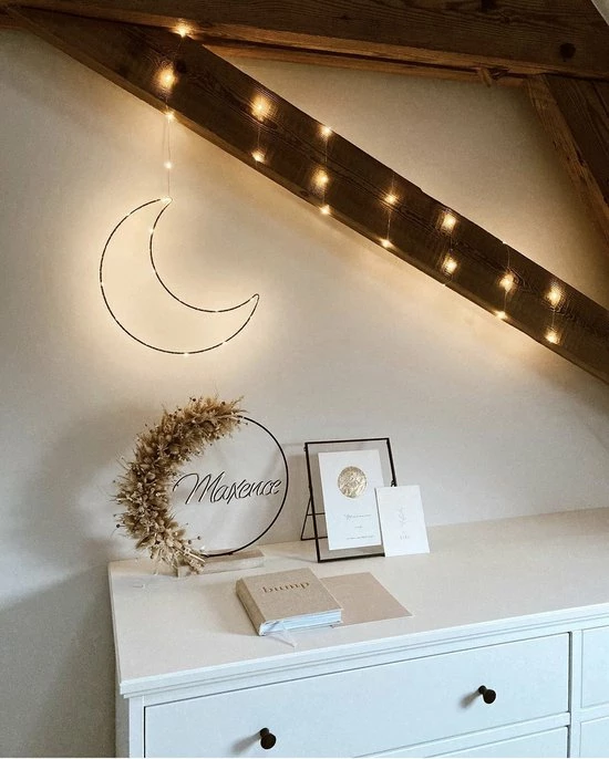 Onze populaire Maanlampje siert al vele kamertjes! Het Maanlampje is 32 centimeter groot en gemaakt van metaal (voorheen aluminium), waardoor deze niet zijn mooie vorm zal verliezen. De draadverlichting op batterij heeft dezelfde kleur als het lampje. Het lampje heeft 100 warme led lampjes die de ruimte ontzettend veel sfeer geven.