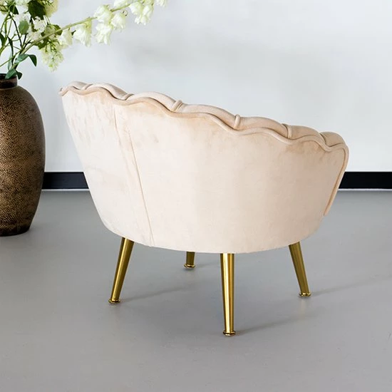 Deze fauteuil Belle heeft een zitting bekleed met stof. Houdt er rekening mee dat de bekleding van de stoel niet afneembaar is. Daarbij is het frame gemaakt van goud gepoedercoat metaal.