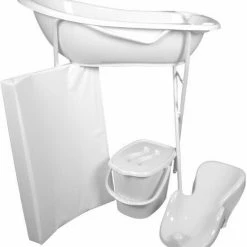 Het badje heeft een mooie vorm en is inclusief afvoer. Het badzitje kan gemakkelijk in het badje geplaatst worden door middel van zuignappen. De standaard is van metaal gemaakt met rubberen voetjes om de vloer te beschermen en is gemakkelijk in te klappen. Op het waskussen kun je je kindje verschonen en de luiers gooi je met gemak in de luieremmer! Kortom: deze badset is onmisbaar in de babykamer!