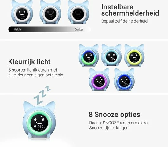 Het is cruciaal om het eenvoudig te houden, zodat je kindje het gemakkelijk kan begrijpen. Om daarmee te kunnen helpen, helpt onze wekker voor kinderen de tijd te laten zien met kleuren en gezichtsuitdrukkingen, in plaats van met cijfers.