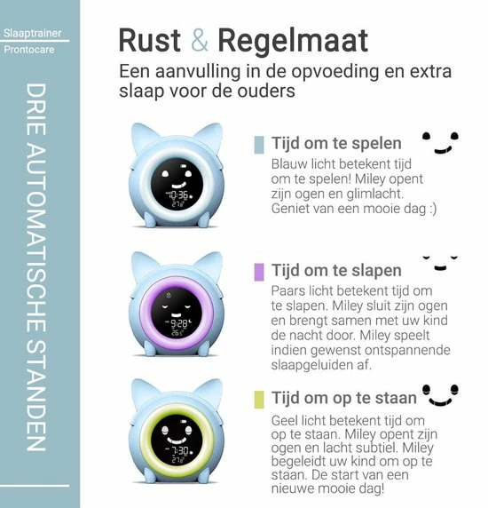 Omdat peuters de tijd nog niet begrijpen, werd slaaptrainer en digitale klok Miley geïntroduceerd om kinderen te helpen begrijpen en begeleiding te krijgen wanneer het tijd is om te slapen! Zie een peuterklok als een soort omgekeerde wekker. Voor volwassenen vertellen onze alarmen ons wanneer het tijd is om op te staan en uit bed te gaan. Kinderen hoeven echter niet vaak te worden gevraagd om wakker te worden. Het is zelfs het tegenovergestelde: ze hebben begeleiding nodig over wanneer het tijd is om te slapen.