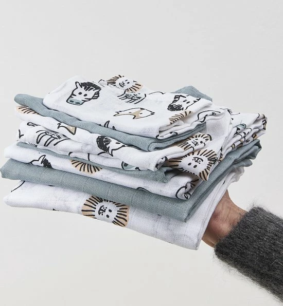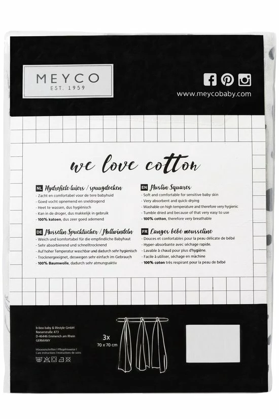 De hydrofiele luiers hebben de afmetingen 70×70 cm. Dankzij de rustige tinten, combineer je de hydrofiele luiers perfect met de complete collectie van Meyco Baby.