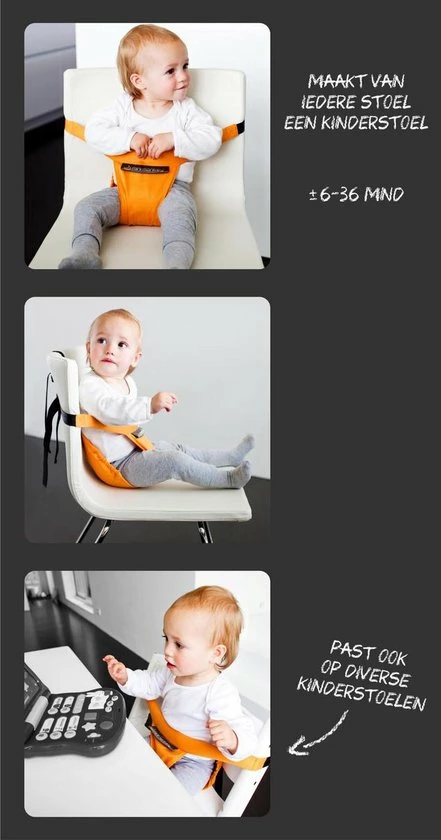 De Minichair past vrijwel op elke normale stoel maar ook op diverse kinderstoelen.