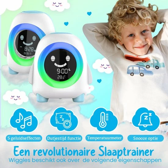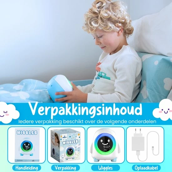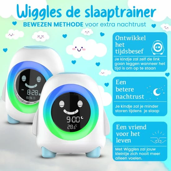Wiggles helpt jouw vroege vogeltje met het aanleren van een gezond dag en nachtritme met simpele symbolen en kleuren. Aan de hand van gezichtsuitdrukkingen en het intelligente kleurensysteem begrijpt jouw kleintje wanneer het tijd is om naar bed te gaan, het tijd is om te gaan slapen en natuurlijk wanneer het tijd is om op te staan! Hiermee levert Wiggles een belangrijke bijdrage aan een goede nachtrust voor zowel ouders als kind.