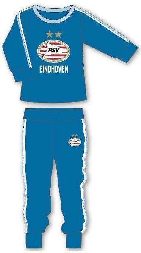 “PSV is ??n van de grootste voetbalclubs van Nederland en verkoopt allemaal leuke producten voor de fans! De pyjama bestaat uit een blauwe shirt met een witte en lichtblauwe bies op de mouwen en een blauwe broek. Deze pyjama is gebaseerd op het nieuwe uittenue van PSV. Zowel het shirt als de broek zijn voorzien van een PSV-logo en zijn gemaakt van 100% katoen. De PSV-fan valt heerlijk in slaap met deze pyjama van PSV.