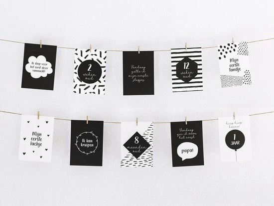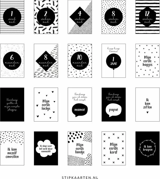 Het eerste levensjaar van je kindje vliegt voorbij. Met deze mooie set mijlpaalkaarten van Stipkaarten.nl kun je de bijzondere momenten tijdens het eerste jaar van je kindje vastleggen. Een mooi aandenken voor jezelf en voor je kindje. Deze set bestaat uit 20 mijlpaalkaarten op A6 formaat. Alle kaarten hebben een blanco achterkant, zodat je hier zelf nog extra aantekeningen (zoals de datum) op kan schrijven.