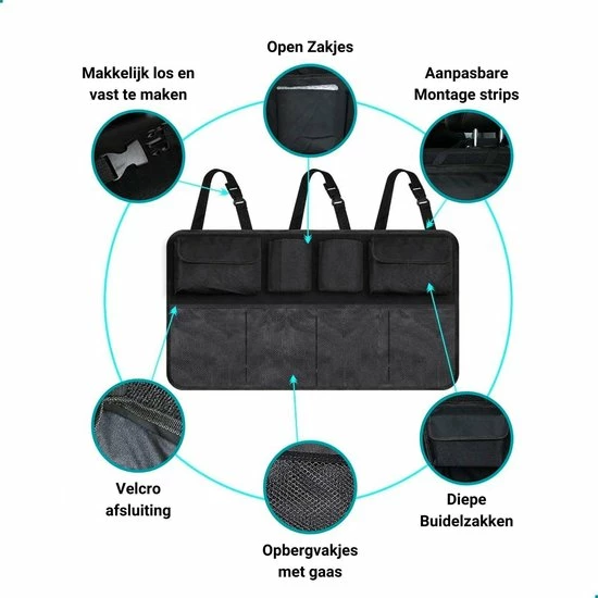 De kofferbakorganizer wordt gemonteerd op de rugleuning van uw voertuig, zodat deze geen ruimte in beslag neemt zoals een bak in de koffer, laat uw kofferbakvloer vrij voor grote voorwerpen zoals kinderwagens en bagage. Absoluut gebruiksvriendelijk!