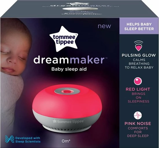 De Dreammaker? is een wetenschappelijk bewezen slaaptrainer met geluid en licht die de baby helpt beter te slapen door ideale slaapomstandigheden te simuleren, in plaats van de baby te stimuleren. Dit unieke slaaphulpmiddel, waarvoor een patent is aangevraagd, is ontwikkeld in samenwerking met een toonaangevend slaaplaboratorium en slaapwetenschappers van de Northumbria University in het Verenigd Koninkrijk. Het ontspant uw baby, stimuleert een diepe rust en zorgt dat hij of zij langer slaapt. Een zeer rustige slaapomgeving is onbekend voor baby’s en kan het voor hen moeilijker maken om in slaap te vallen. Dit innovatieve slaaphulpmiddel voor kinderen is voorzien van roze ruis die de natuurlijke geluiden nabootst die de baby de hele dag hoort en hem of haar daardoor een gevoel van rust en comfort geeft. Door roze ruis op te nemen wordt gezorgd voor een geruststellend achtergrondgeluid dat helpt om sneller, dieper en langer in slaap te vallen. Melatonine (het slaaphormoon) is een van nature voorkomend hormoon dat het lichaam aanmaakt als reactie op duisternis en helpt om de slaapcycli onder controle te houden. Blootstelling aan licht kan de afscheiding van melatonine onderdrukken en het begin van de slaap vertragen. Onderzoek heeft aangetoond dat in vergelijking met blootstelling aan andere lichten in het spectrum, blootstelling aan rood licht weinig tot geen effect heeft op de onderdrukking van melatonine. Ons onderzoek heeft aangetoond dat een slaaptrainer met rood licht de baby kan helpen sneller in slaap te komen, langer door te slapen. Bovendien blijkt hij minimaal stimulerend te zijn wanneer de baby ‘s nachts wakker wordt, waardoor het gemakkelijker wordt om weer tot rust te komen. Gebruik hem ‘s nachts als nachtlampje bij borst- of flesvoeding om verstoring tot een minimum te beperken. Kies uit 3 helderheidsniveaus voor een geruststellende en ontspannende gloed die de baby (of u) niet zal storen als hij of zij eenmaal slaapt. De ritmisch pulserende lichtgolven moedigen langzame, diepe ademtochten aan om de gebruiker, die klaar is om te gaan slapen, te ontspannen. De eerste, snellere pulsinstelling weerspiegelt de ademhalingsfrequentie van de baby’s in rusttoestand, waardoor ze beter in slaap vallen. De tweede, langzamere hartslag bootst uw ademhaling in rusttoestand na en helpt u beter in slaap te vallen!