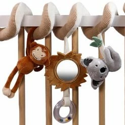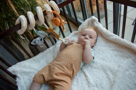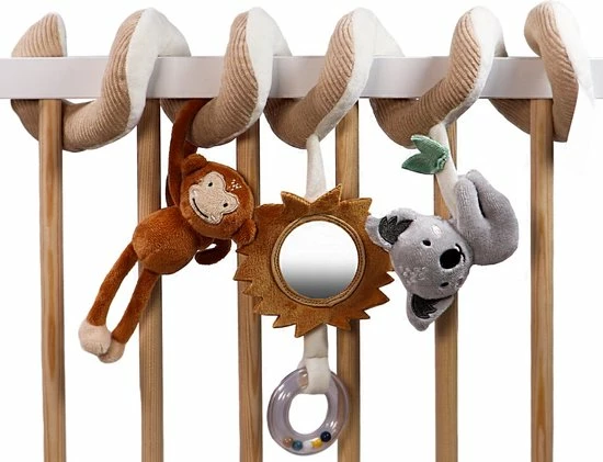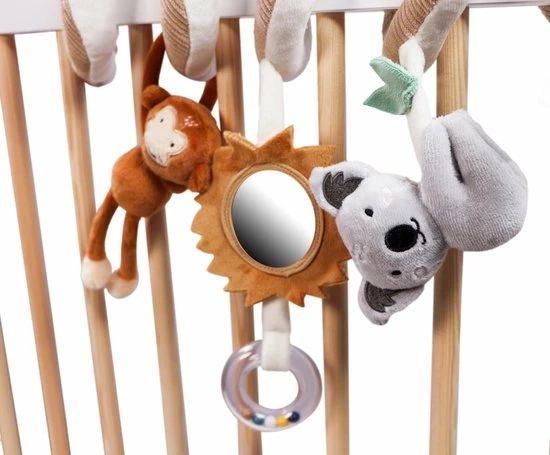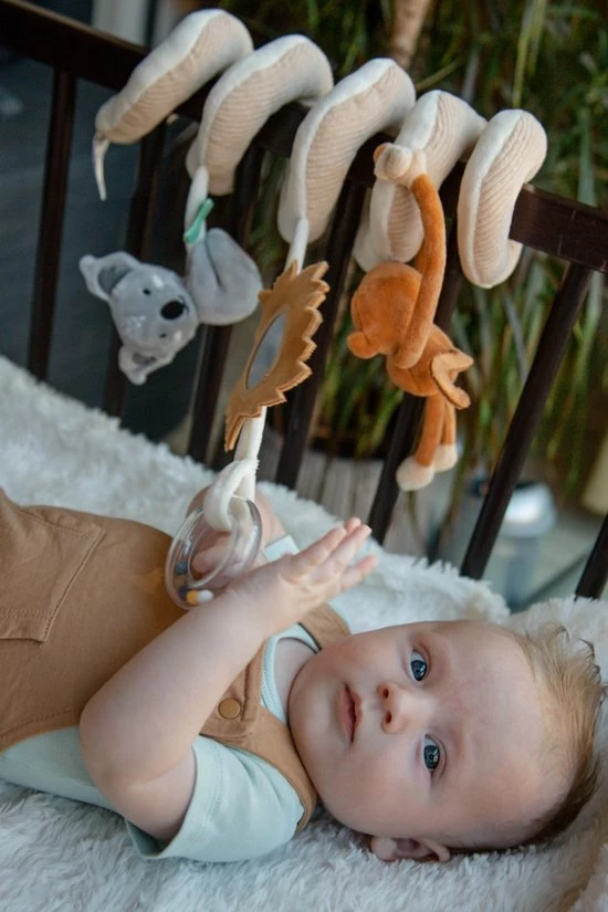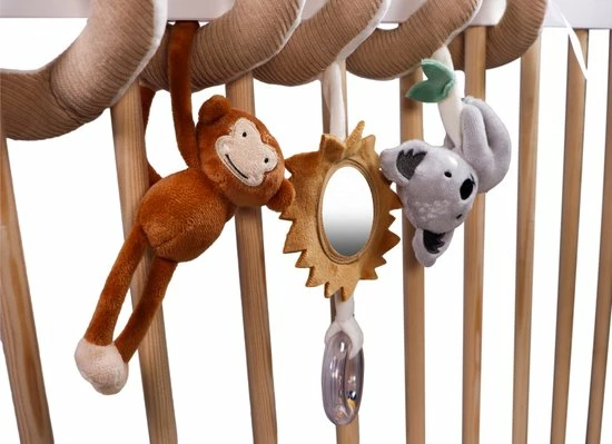 De boxspiraal bestaat uit een aap en koala knuffeltje en een spiegeltje met manen en rammelaar! Genoeg activiteiten om je kindje te stimuleren om ernaar te grijpen en lekker mee te spelen.
