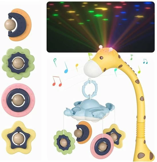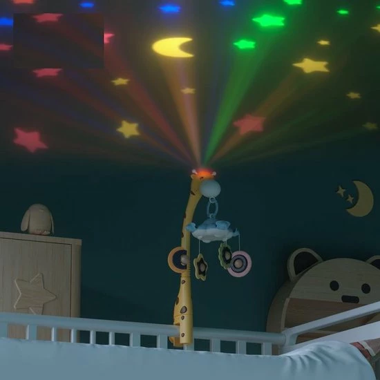 Met deze multifunctionele witte muziekmobiel met projector wanen kinderen zich al snel in dromenland. Kleine kinderen hebben vaak moeite om in slaap te komen. De combinatie van muziek, projectie en kleuren stelt jouw kind gerust waardoor het heerlijk kan slapen. Deze muziekmobiel projecteert een prachtige sterrenhemel op de muur of het plafond. Met ??n druk op de knop wissel je gemakkelijk tussen de kleuren rood, groen, geel en blauw. Door het unieke ontwerp kan de muziekmobiel zowel horizontaal als verticaal aan een box of bedje bevestigd worden.